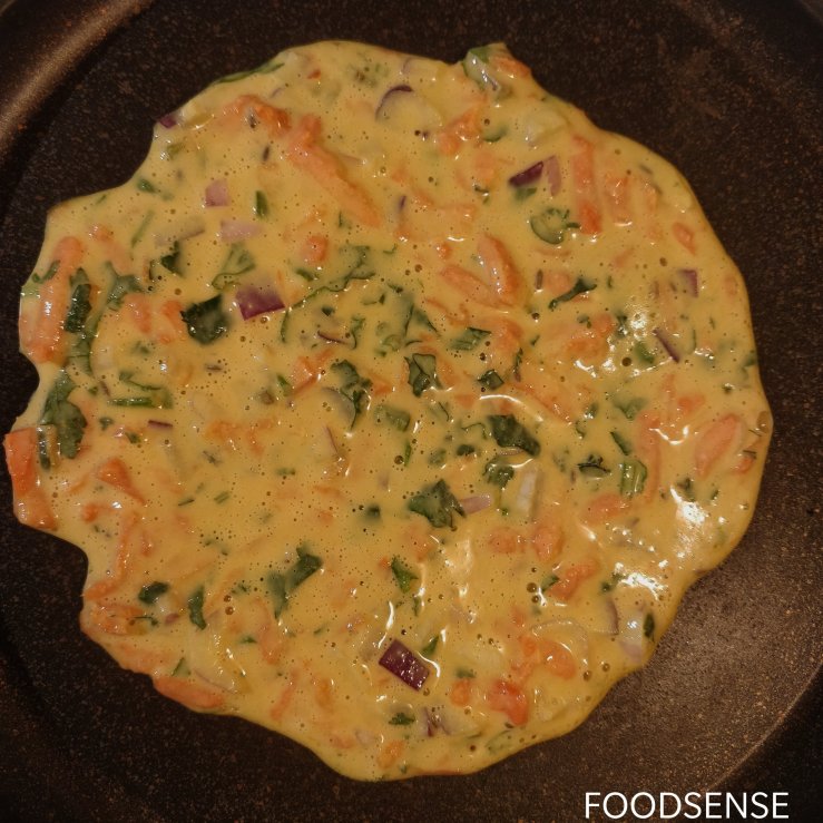 - Mix the resting batter. Make sure the heat is on low to medium flame. With help of a ladle pour half of the chilla mix on to hot pan. Spread it quickly if you like it thin. It wont be super thin because of the veggies.